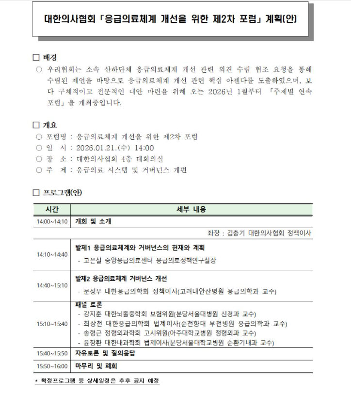 [대개협 제2026-0316호] 대한의사협회 「응급의료체계 개선을 위한 제2차 포럼」 개최에 따른 참석 및 협조 요청의 건